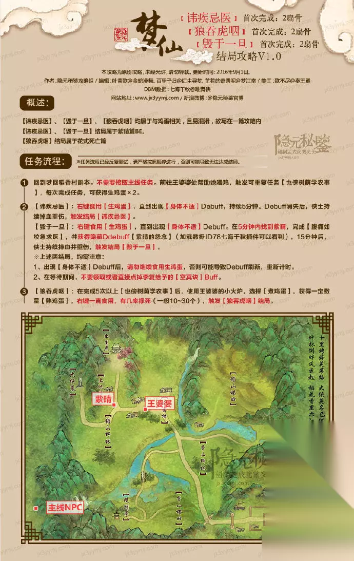 剑网3梦回稻香活动共有21个可达成的结局,结局分别为毁于一旦、讳疾忌医、狼吞虎咽、青云直坠、害人害己、隐士高人、路止狂童、闯荡江湖、易道殊途、猪运亨通、御兽宗、一世长宁、铁血黎明、诏安悍匪、重振药宗、舍身济世、俪影侠踪、重写史篇、何必执着、长草萋萋、悬壶济世,下文为大家列举具体的各个结局的达成流程选择攻略! 剑网3梦回稻香21个结局流程达成方式攻略 一、花式阵亡类结局 1、毁于一旦 直接找王婆婆做喂鸡任务,得到的生鸡蛋直接食用,获得健体buff,描述为增加攻击力,实际并没有。 一定概率因食用生鸡蛋而中毒(此debuff大幅度降低移动速度),此时提示我们去找紫晴救助。对话后解毒。 实际上并没有,挂机等待15分钟,开始生机流失,随后阵亡。获得“毁于一旦”成就。 2、讳疾忌医 直接找王婆婆做喂鸡任务,得到的生鸡蛋直接食用,一定概率因食用生鸡蛋而中毒(此debuff大幅度降低移动速度),不去找紫晴救助,挂机5分钟后,生命流逝,随后阵亡。获得“讳疾忌医”成就。 3、狼吞虎咽 直接找王婆婆做喂鸡任务,随后继续做五次喂鸡任务,开启王婆婆的小火炉,煮鸡蛋。一直吃熟鸡蛋,突然,嘎嘣一下。获得“狼吞虎咽”成就。
