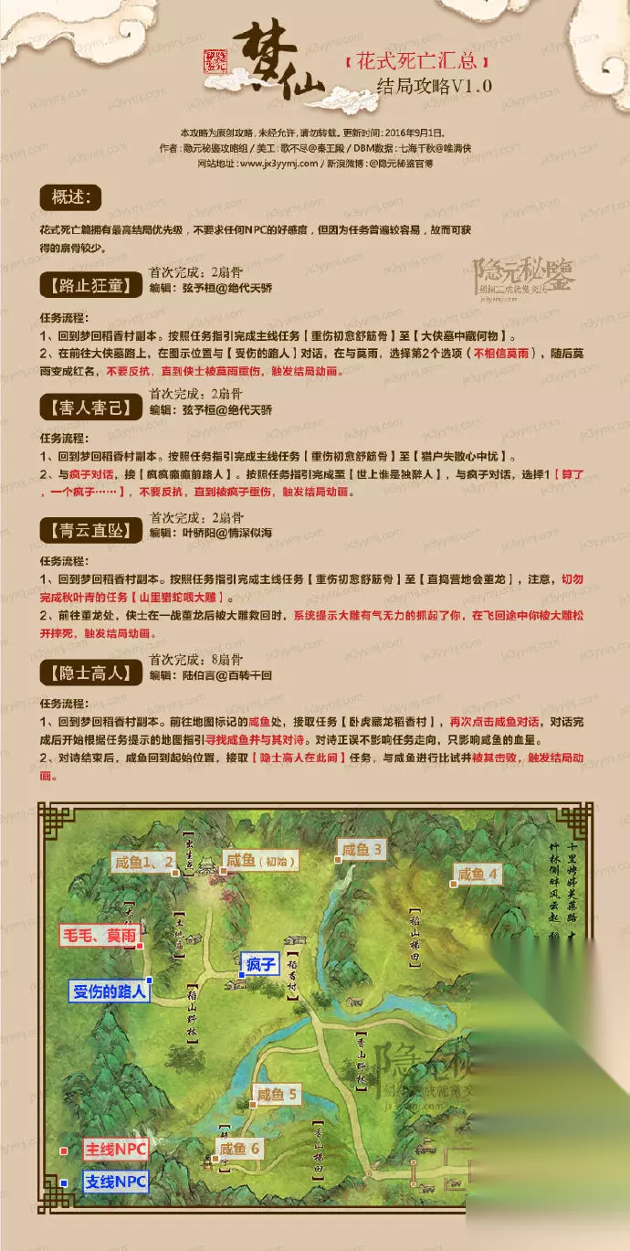4、青云直坠 按照任务指引,一路做下去,秋叶青的雕有气无力地快飞到地方把你扔下去摔挂了。包括之后的所有需要通关的任务,请在王大石让你找董龙练一练的时候,先喂鸟! 5、害人害己 按照任务指引,一路做下去,做到张忠(村中猎户)任务后,可以与村中疯子(张大眼之父)对话,开启。 与村长刘洋对话,村长让你去破庙中取不知道哪年的还没有密封的旁边无赖小混混看着都觉得臭的酒给张大眼喝,取到之后张大眼实在不放心将你喊住,千叮咛万嘱咐,千万别给他爹喝。但我们找到张大眼之父后,二话不说就选择将就给他喝下,疯子立刻发疯进攻我们,随后我们嘎嘣一下。获得“害人害己”成就。 6、隐士高人 直接在刘大海附近找到咸鱼与他对话,随后咸鱼飞往地图上面的六个点(会有标记),我们跟上去与其对应景的诗(二选一全选第一个就对,嗯,是不是有点过于敷衍了)六句诗全部答对后,咸鱼邀请你比试,被他打到嘎嘣一下。获得“隐士高人”成就。 7、路止狂童 任务一直做下去,做到村长刘洋让你去大侠墓取包裹,路上遇到NPC受伤的路人喊住了你,对话后,找到莫雨,选择不相信他。莫雨发狂攻击你,莫雨本身攻击力比较低,中间有读条伤害技能,伤害略高,建议还是提前脱掉装备。随后你嘎嘣一下。获得“路止狂童”成就。