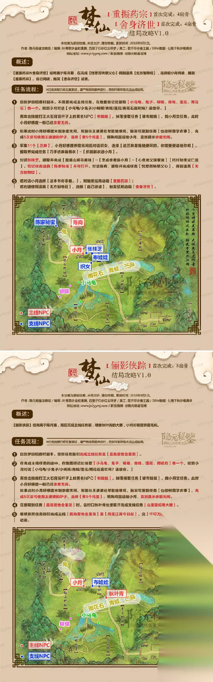 2、诏安悍匪 需要提前打通至少7个不同的结局 蒋玉凤会给我们武器制造图谱,交给李复之后,李复看过之后说好了,继续让我们跑腿,一边找人制作弩箭,一边找毒害了我们多次的紫晴大佬制作毒液,一边还得陪着村长假意投降。等待武器完工,我们直接火力压制了董龙,果真一切的恐惧都来源于火力不足。 五、陈月篇 1、重振药宗 需要刷满小月的好感度。 小月的好感度比较容易刷,打下洋娃娃送给她,到处可以捉到兔子,捡到小乌龟送给她,随后随便送几个熟鸡蛋就可以刷满了。 随后触发任务,我们顺着做就可以了,这里织女给小月做衣服的道具可以在岸边采集,捉小乌龟的时候顺便就能捡满了。 最终拿到药宗信物后,送还给小月即可。随后一同江湖行医,小月成为药宗宗主,我们继任副宗主。 2、舍身济世 需要刷满小月的好感度。 小月的好感度比较容易刷,打下洋娃娃送给她,到处可以捉到兔子,捡到小乌龟送给她,随后随便送几个熟鸡蛋就可以刷满了。 随后触发任务,我们顺着做就可以了,这里织女给小月做衣服的道具可以在岸边采集,捉小乌龟的时候顺便就能捡满了。 最终拿到药宗信物后,直接自己贪了即可。随后我们带着小月行医,成为药宗宗主。