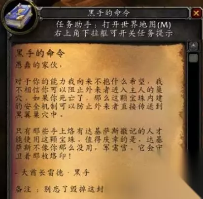 面向副本门口右手边有个通道,通道往里走左手边第二个洞口里会看到一个稀有精英NPC裂盾军需官; 击杀掉NPC裂盾军需官会拾取一个任务道具[黑手的命令],使用该道具后会接到任务[黑手的命令],然后可以进行下一步:打通[黑石塔-上层]; 2、打通[黑石塔-上层] 接到任务[黑手的命令]后,我们去打通10人团队副本[黑石塔-上层],并击杀最后BOSS达基萨斯将军; 在BOSS达基萨斯将军的身后我们会看到一个宝珠,与之互动便可以完成任务[黑手的命令]; 黑翼之巢开门任务到此结束; 完成以上步骤后,此时,我们来到黑石塔副本门口右边通道的尽头会看到一个绿色宝珠,与之对话互动即可进入副本之中。