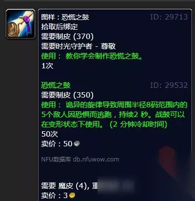 在游戏《魔兽世界怀旧服》中,玩家冲制皮365-370熟练度推荐用裂蹄牛套,370-375熟练度推荐用时光声望买的恐慌之鼓图样。时光之穴的恐慌之鼓和沙塔尔的战斗之鼓都是只需要尊敬声望就能购买,制作这两种装备提升得很快。
