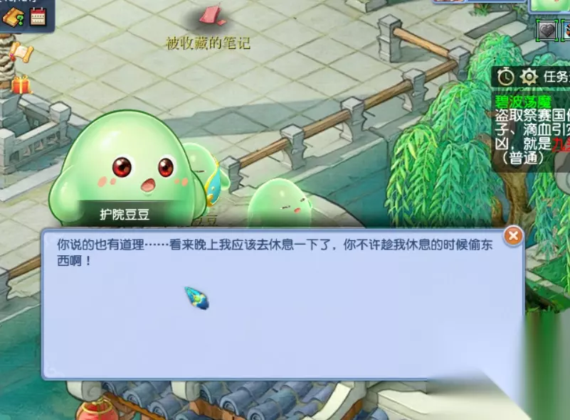 打爆一个,剩下的就全爆了。 支线4:左上角的笔记,门口有一个护院豆豆不让你近。点他对话会说,晚上会休息,让咱们晚上不许偷东西。