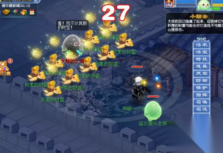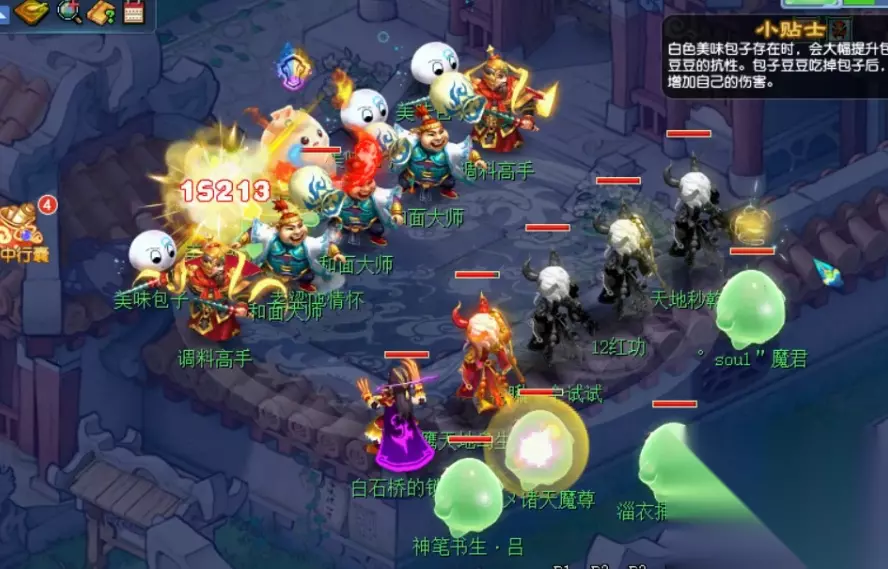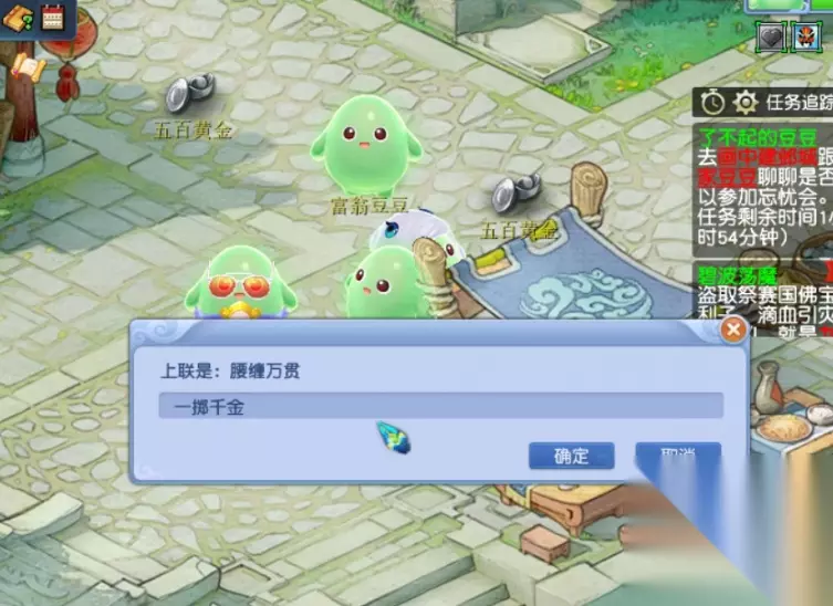 旁边的四个白色泡泡在场的话,主怪的抗性极高,基本打不动。而且主怪会吃掉包子,提升伤害。因此套路就是优先击杀四个白色泡泡,然后秒了主怪。 实际战斗中,我随便拉了个队伍,挑战普通难度,挂机3回合结束。 主线完成后有三个支线: 支线1:左上角的对王豆豆还在,上联腰缠万贯,旁边的提示是一个富豪,地上两坨500两黄金,加起来就是千金。所以下联就是,一掷千金。