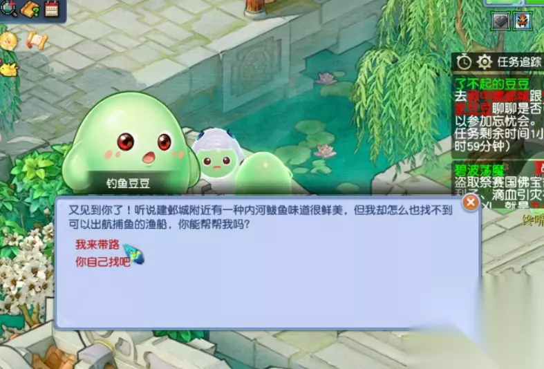 支线2:钓鱼豆豆也还在,点击以后,会跟着你,要找某一种鱼。带着他走到230.55处的船附近,自动完成。