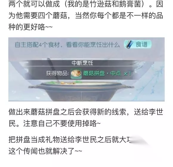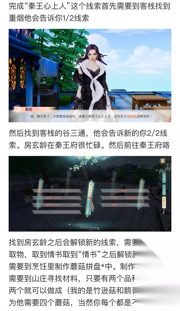 1.客栈在传秦王喜欢西域女子 2.秦王派房玄龄每天送情书 3.房玄龄在秦王府很忙碌 4.想办法从房玄龄身上拿到秦王的情书 5.烹饪里制作蘑菇拼盘?中作为晚宴食物 6.听听皇宫李世民解释原委