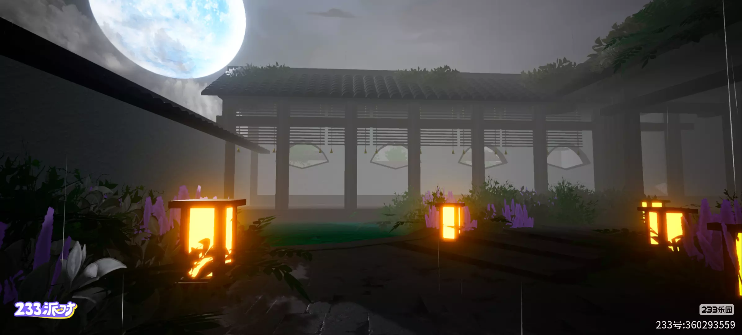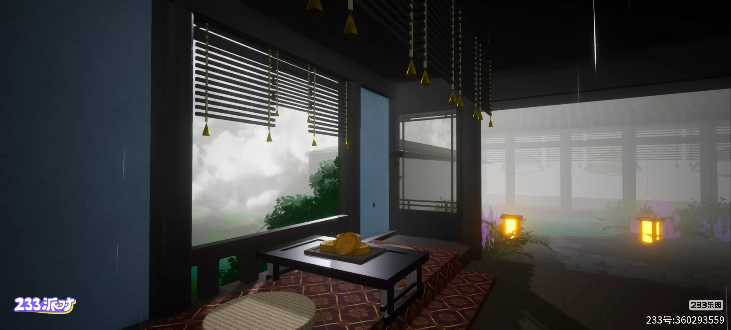 地图的样子:进入地图之后,眼前有四盏灯,还有一个小池塘,地板是石地,周围有些花花草草,周围是亭子。亭子里边有竹窗帘,还有一张桌子和两个圆垫。桌子上面还有一碟月饼。
