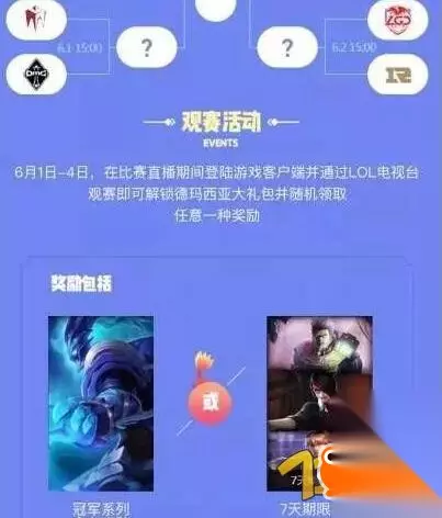 在6月1日—4日比赛期间,登录游戏客户端并通过LOL电视台观赛,即可获得德玛西亚大礼包并随机领取一种奖励!