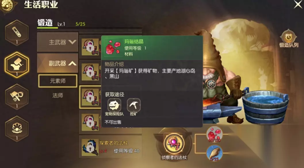 铁匠锻造珠宝 在凑齐材料之后,我们制作装备也是要选择一个方向的,龙之谷2中的生活职业,分为炼金、锻造、铁匠、珠宝四种。 炼金是制作各种回血和加状态药剂的,材料主要靠宠物探险获得。 锻造是制作主副武器的,用的材料主要是矿石和分解材料。 铁匠是制作防具的,也就是衣服鞋子类的东西,用的材料跟武器差不多,珠宝则是制作饰品的。 这次生活职业,都是有等级的,所以玩家初期的选择还是比较重要的,要是全都要,并且有时间肝的话,那就无所谓了,如果时间比较少,那建议选择锻造,反正制作武器总比另外两项更重要一些。