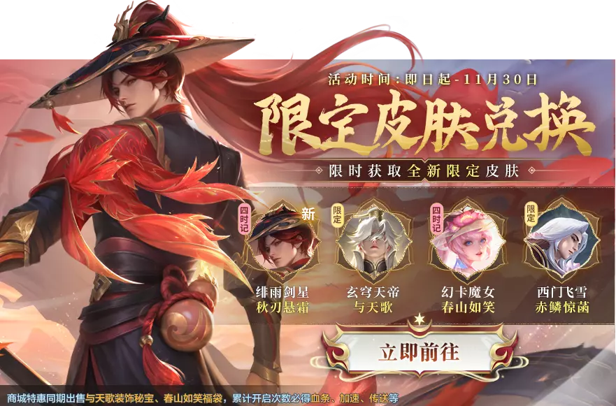 限定皮肤兑换开启,绯雨剑星-秋刃悬霜、玄穹天帝-与天歌、幻卡魔女-春山如笑、西门飞雪-赤鳞惊菡等你来拿!