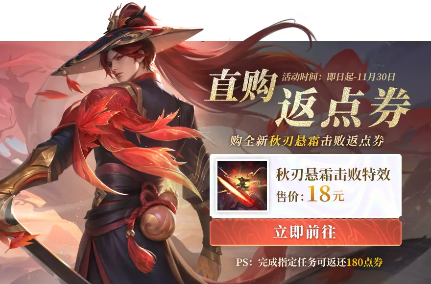 花费18元立即获得全新秋刃悬霜击败特效,并开启专属任务!完成指定的任务后可返还180点券!