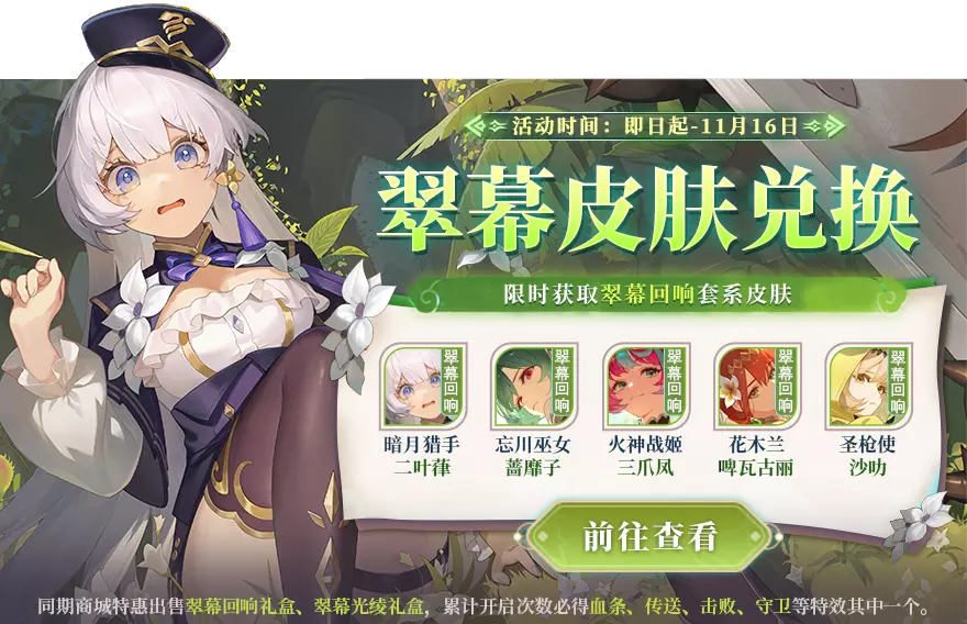 翠幕限时兑换开启,火神战姬-三爪凤、暗月猎手-二叶葎、忘川巫女-蔷靡子、花木兰-啤瓦古丽 、圣枪使-沙叻等你来拿!