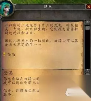 双塔山奸商夫妻档 40多级的时候,在菲拉斯练级,路过双塔山时偶然遇到一个漂亮的夜精灵妹子。她的穿着好像冒险家一样,独自一人在篝火旁站着微笑地看着我。好奇心的驱使让我过去与她搭讪,结果发现居然还有任务,而且她还说可以送人上山,山上风景独特。 看着菲拉斯郁郁葱葱的景色,有点心动,于是二话不说就点了接受。