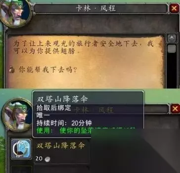 等到了山顶欣赏过菲拉斯锦绣的风景后,却发现这里根本没有下山的路啊。这时候又发现山顶上居然还有一个男的暗夜精灵,站着啥也不干,就在那卖一件东西:降落伞。 以这里的高度,想要下山真的就只能找他买这个。