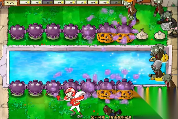 针对不同僵尸特性的应对方案需要提前规划。铁桶僵尸需集中3-4个双发射手的火力持续打击;撑杆僵尸需在前排设置大蒜或额外高坚果干扰其跳跃路径;橄榄球僵尸出现时应立即使用寒冰菇控制,并配合樱桃炸弹清除。毁灭菇的部署时机至关重要,建议保留至第四波僵尸密集时使用,需注意爆炸后产生的坑洞会永久占用格子。磁力菇可有效削弱铁桶僵尸防御,但需计算好其冷却时间与僵尸波次的匹配关系。