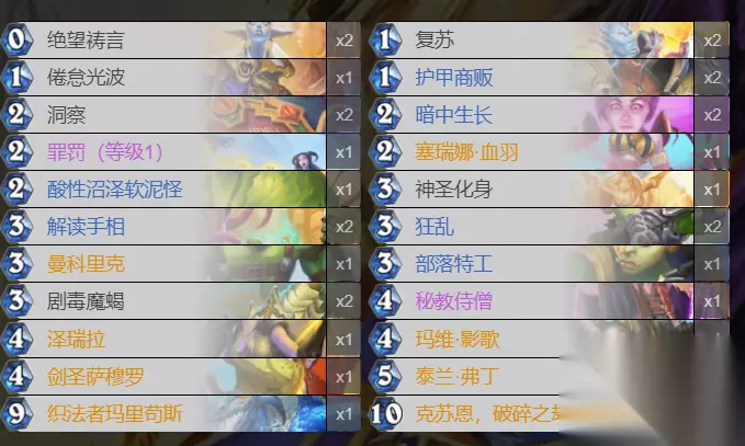 二、克苏恩牧起手留牌及对阵思路 在克苏恩牧的起手留牌方面,这套卡组主要留下一切可以形成combo联动的卡组组合,例如在手牌有泽瑞拉的情况下,可以找绝望悼言,复苏这类低费回血卡,在有剑圣时可以找狂乱这类buff手牌。在遇见带刀职业时留下软泥怪,遇见奥秘职业时留下部落特工。