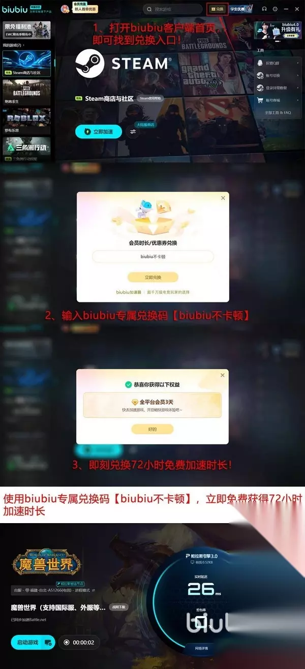 最近biubiu还迎来了重要的升级,将其核心的“帕拉斯引擎”升级到了3.0版本,有着更加智能的线路切换,以及加速效果。同时还邀请了专业人士,pubg世界冠军左梓轩作为体验官参与调优,更进一步的验证了其加速能力有多么的强悍。不仅如此,biubiu还给到了试用时长,新用户24小时叠加“biubiu不卡顿”口令码换取72H的加速时间,合计就是96H,足够大家去深度体验它的效果了。