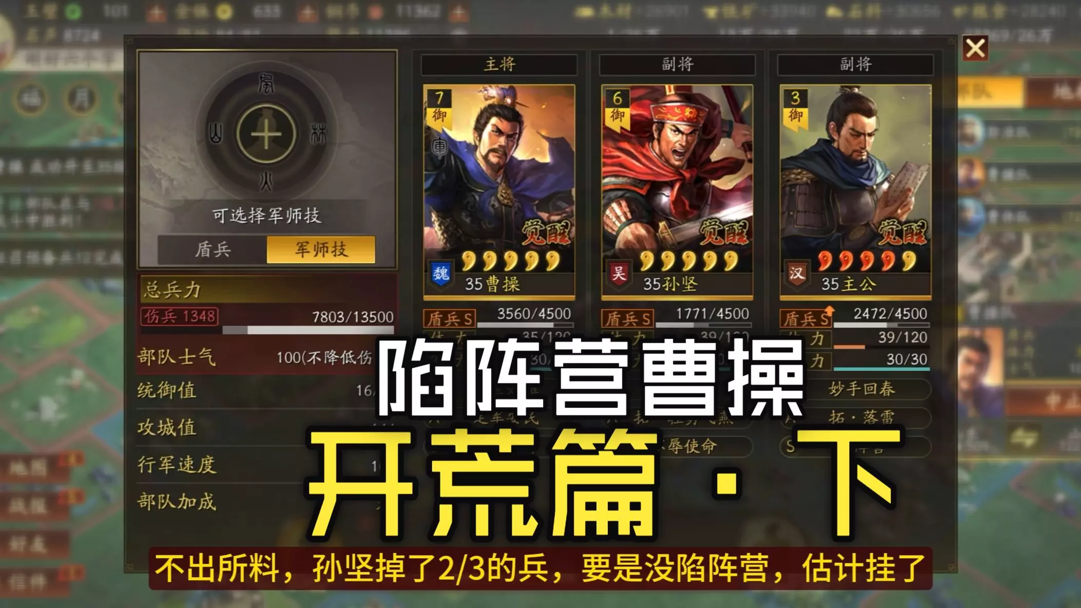 玩家分享《三国志·战略版》游戏体验,称曹操盾阵容里孙坚表现不佳,调整战法后,展示了曹操、主公、孙坚组成的盾兵阵容的战斗战报,还提到被俘后领金珠抽卡,拜师吕布尝试新玩法。