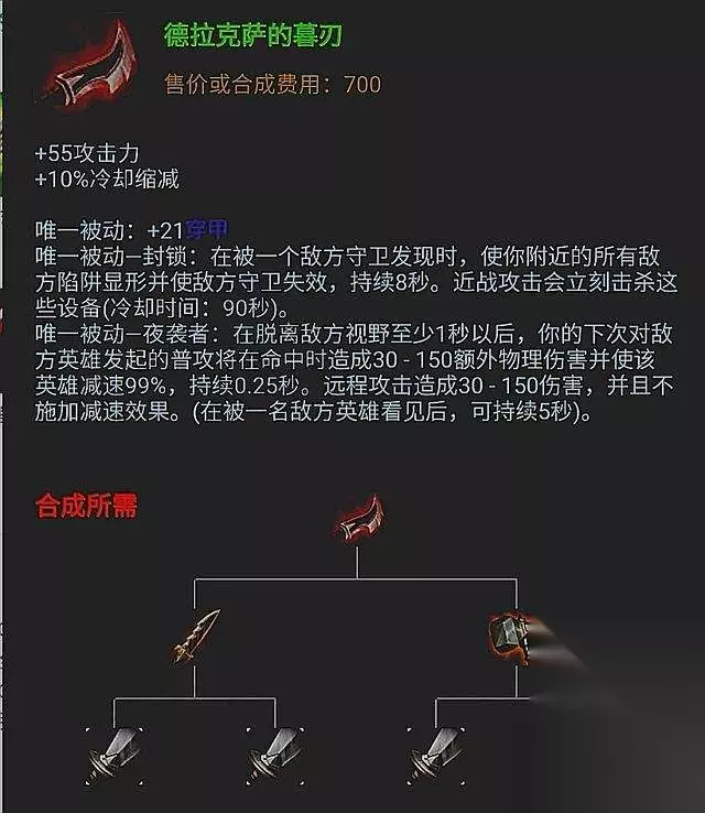 相比于饮血剑,血刃的价格相对较低,并且血刃的被动能够提供攻击力和生命偷取的加成,从性价比来看,血色之刃这件装备不会小于饮血剑。 穿甲装备首选幕刃,这套出装的思想就是追求一刀的伤害。