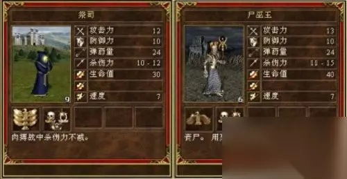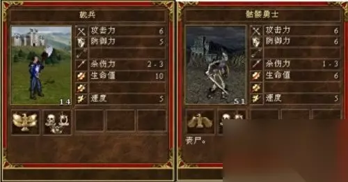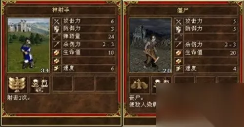 从属性上看,单个戟兵完胜骷髅勇士,但是作为墓园的当家主力兵种,骷髅勇士怎么会输给戟兵呢,不要忘了墓园的当家技能-招魂术,通过招魂术,可以堆积骷髅兵的数量,当成千上万的骷髅海冲过来的时候,那是很绝望的。因此,在数量上,骷髅兵远远强于戟兵,此局,亡灵族完胜。0:1。 2,神射手VS僵尸