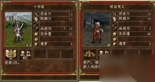 人族的3级兵皇家狮鹫对阵亡灵的飘飘,飘飘吸魔法的技能对皇家狮鹫毫无用处,被皇家狮鹫狠狠地挠趴,无论数量还是质量,皇家狮鹫完胜。2:1 4,十字军VS吸血鬼王