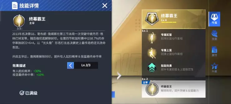 ● 詹姆斯的专属技能:终幕霸王!球场最终攻势开启,由我詹姆斯完成强势终结,在解锁多套专属动作的同时,大幅提升对抗时起扣概率与投篮最终命中率,在开启主宰后还会有小彩蛋,詹姆斯的发带将会消失!这不是Bug,而是他解除封印的信号!比赛推进到关键时刻,由我詹姆斯接管比赛!执行战术——把球交给詹姆斯,且看小皇帝披荆斩棘,天神下凡逆转结局!