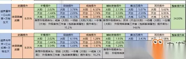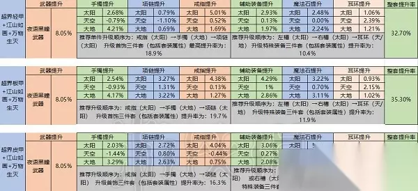 巨剑流提升: 模板:取9.24改版后,红10,12武器,12副手,12耳环,完美新附魔,双返本白金,新国庆三攻光环,本模板巨剑流参考打桩顺序为双游龙双碎岩单爆剑,天空耳环下可以稳定双爆剑,故天空耳环提升量计入了多打的一次爆剑,天空系列仅量化了耳环,其余未量化CD。 实战选择建议 重甲项链大地或太阳实战基本持平均可选择;重甲右槽打桩大地太阳持平,实战太阳略强,其余同轻皮板。布甲右槽大地稍强于太阳,其余同轻皮板。已经可以的确定最优选择部位:轻皮板项链,戒指,左槽,右槽必定选择太阳。 手镯,耳环争议部位: 光剑: 1.耳环:天空≥大地>太阳(重甲天空≥太阳>大地)。 由于返本加强原因大地耳环也比太阳略强,天空耳环修炼场能稳定增加一发乱花,实战30S磨血有机会打出第三发爆剑和稳定第四发碎岩/游龙,实际提升天空最强,但考虑到部分佛系玩家并不想追求极限或CAO作难以跟上,实际选择大地耳环也比较舒适(重甲太阳)。 2.皮甲情况:皮甲自带较高技能等级,但即使略微稀释,手镯选择大地时提升量仍然高于太阳;其余甲由于返本加强的原因大地全面高于太阳。 巨剑: 1.耳环:天空≥大地>太阳,(重甲天空≥太阳>大地) 由于返本加强原因大地耳环也比太阳略强,天空耳环修炼场能更加稳定打出双爆剑双碎岩游龙,意义非常大,实战30S磨血能打出第二发湮烈掌,且有机会打出第四发碎岩/游龙,所以选择建议同光剑一样首选天空,根据个人情况也可选择大地(重甲太阳)。 2.手镯:皮甲自带较高技能等级,但即使略微稀释,手镯选择大地时提升量仍然高于太阳;其余甲由于返本加强的原因大地全面高于太阳。