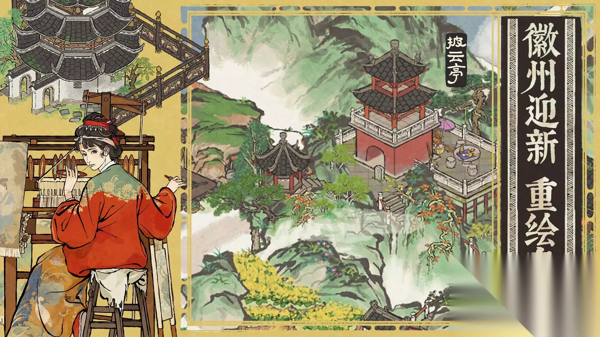 小巷深深梦徽州,白墙黑瓦看江南。在江南居民的探索下,我们发现了「徽州府」这片新地区。现在,知府大人可以带领居民们一起前往探索。 全新奇观「披云亭」现在伫立于徽州新地区,而且大人们可以自由营造布局,装饰「十二楼」和「木雕围栏」,为徽州增添水墨风情。