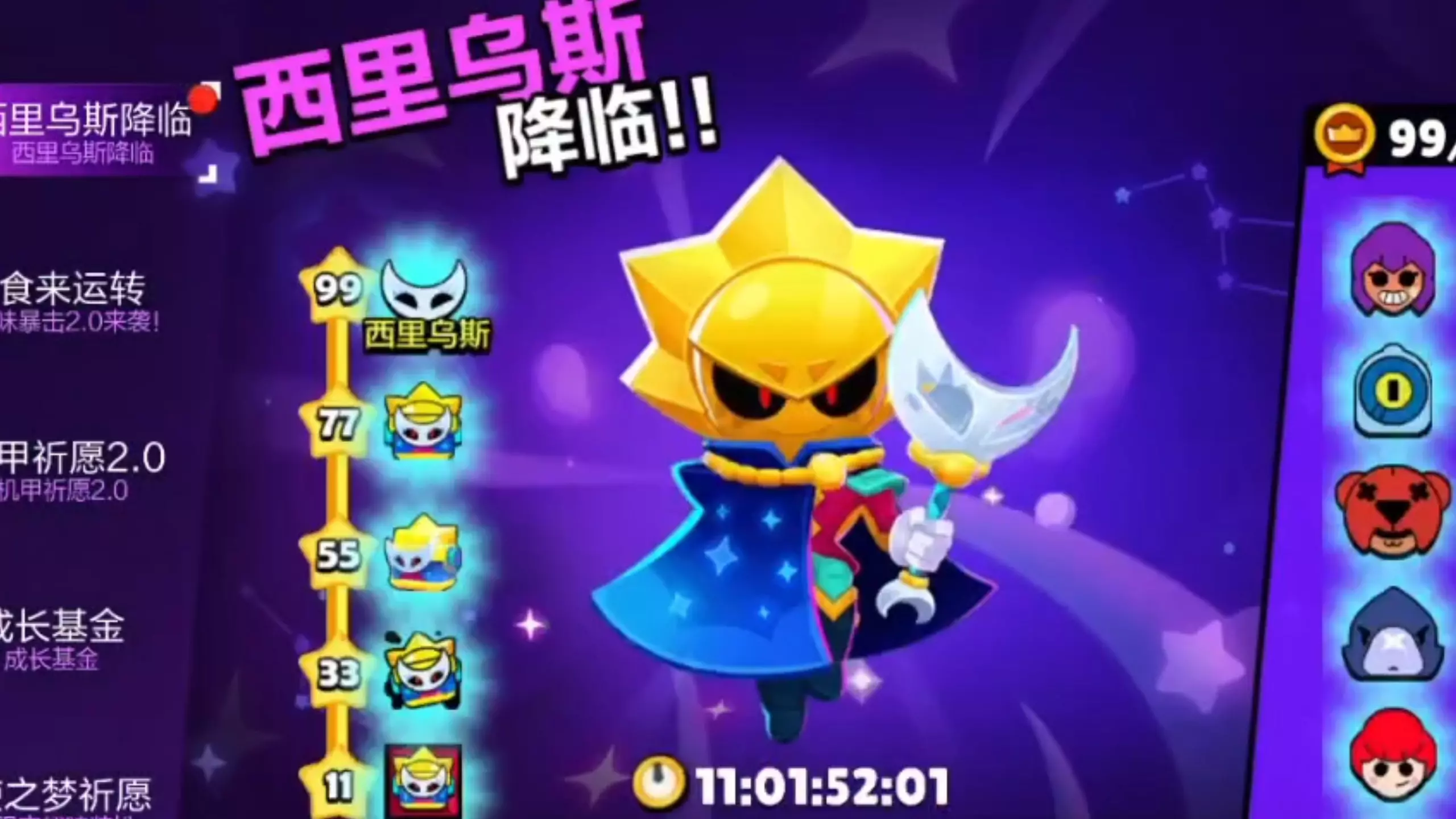 这是荒野乱斗的游戏开箱内容,玩家领取了10365张英雄券,解锁了超凡控场英雄西里乌斯,还展示了该英雄的属性、超凡天赋等信息。