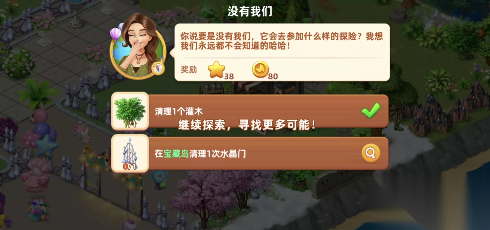 2、过关技巧 前面说了,这是一款休闲类型的游戏。其实游戏的过关基本上只需要我们消耗一些素材就可以达成要求,基本上三星三个要求,只要完成了就可以通关剧情来到下一阶段,另外,在过关的时候要注意一下它的过关要求,先不要急着开采地盘获取资源等等,按照要求过关就不容易卡关。比如说他需要20个香蕉,那是你因为缺木头,把香蕉树全砍了,发现香蕉不够就只好重新再种,非常的麻烦。所以特别是过关党或者说速通党一定要了解要求,过关才可以较为流畅。