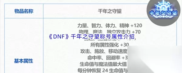 DNF地下城与勇士千年之守望称号属性是攻击强化+30%、命中率、回避率+3%、三次觉醒被动技能等级+1、力量、智力、体力、精神+120、物理、魔法、独立攻击力+70、物理、魔法暴击率+15%、所有属性强化+30、攻击、施放、移动速度+4%。那么DNF地下城与勇士千年之守望称号属性是什么呢?下面小编给大家详细介绍下,还不清楚的小伙伴们快来看看吧! >>>>相关攻略推荐:《DNF》地下城与勇士2024年春节套礼包内容爆料汇总分享
