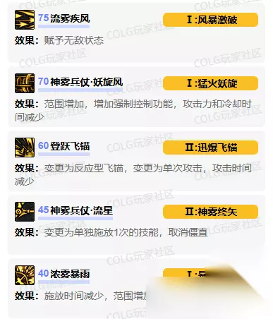 技能进化加点 40级【浓雾暴雨】加点:暴雨剑岚 变为一次性发射所有箭矢,范围增加 45级【神雾兵仗·流星】加点:神雾终矢 变为单独使用的技能,取消僵直,冷却40S,删除填充 60级【登跃飞锚】加点:迅爆飞锚 变更为单次攻击,周围存在敌人立即爆炸,锚持续10S,时间内重新安装不会消失 70级【神雾兵仗·妖旋风】加点:猛火妖旋 范围增加,被攻击的敌人获得3S强控,攻击附加灼伤,冷却40S,攻击力减少 75级【流雾疾风】加点:风暴激破 获得无敌,连射时跳跃则立即发动最后一击 技能强化 1、装载烟花漫天:技能伤害 2、流雾疾风:技能伤害 3、神雾兵仗流星:技能冷却/伤害