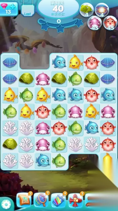【乌龟】 最常见的障碍,消除周围的小鱼可以收集它们,但需要2次才能实现。 第一次消除可以打开龟壳,第二次可以进行收集。如果配合道具“鱼食”,则瞬间就能打开龟壳。 【珊瑚】 关卡中经常出现障碍,分为白珊瑚和红珊瑚。 白珊瑚一次消除,可以匹配周围小鱼或使用炸弹和火箭快速消除;红珊瑚则会复制再生,并且复制特别快,遇到红珊瑚优先消除避免复制太多给通关带来困难。 【贝壳】 和乌龟类似,需2次消除障碍。 需第一次打开贝壳,第二次消除,可以使用道具“鱼食”,打开贝壳减少过关的难度。 【鱼缸】 匹配周围小鱼可打破鱼缸解救小鱼。 尽量连续消除产生炸弹,炸弹打开鱼缸非常简单,而道具“剪刀”也可剪开鱼缸。