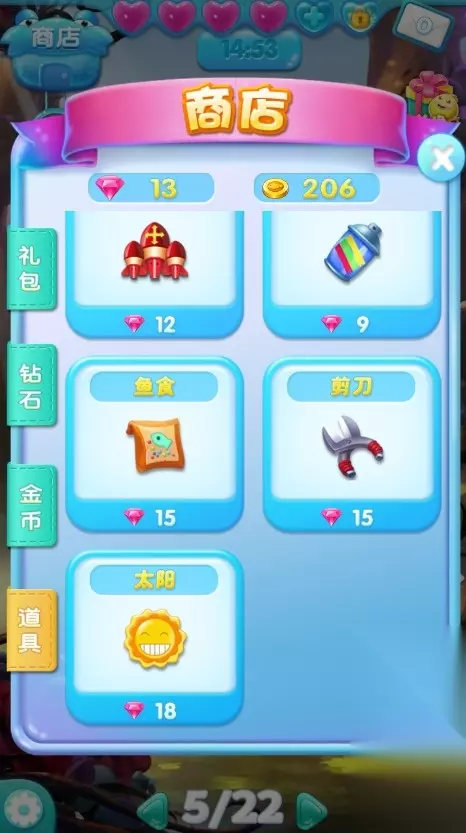 【锁链】 常和鱼缸一起出现,增加游戏障碍和难度。 首先要解锁鱼缸,才能进一步解救小鱼。解锁可通过消除周围小鱼、匹配炸弹火箭打开。如果锁链较多,建议到使用道具“剪刀”辅助过关。 【冰块】 后期关卡增加的障碍,需要消除冰块得到小鱼。 使用“太阳”融化冰块,也可通过炸弹或火箭消除。 【其他障碍】 空格等其他无法通过匹配小鱼消除的障碍,需使用炸弹或者火箭来消除。