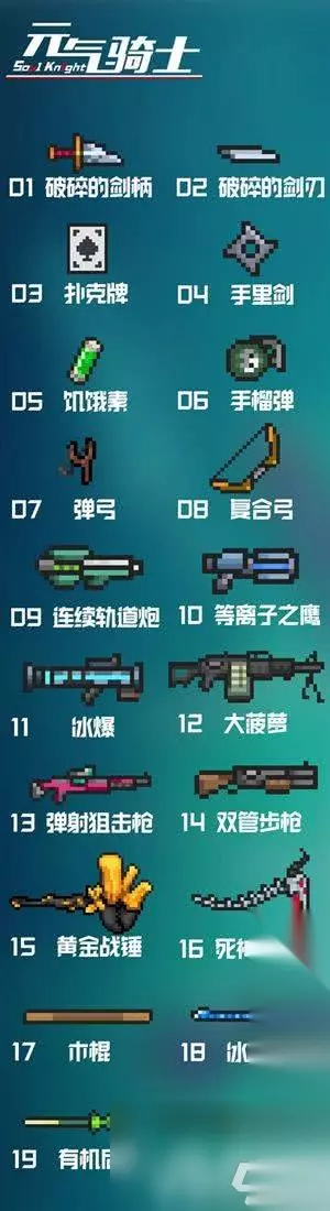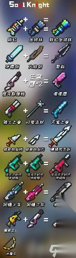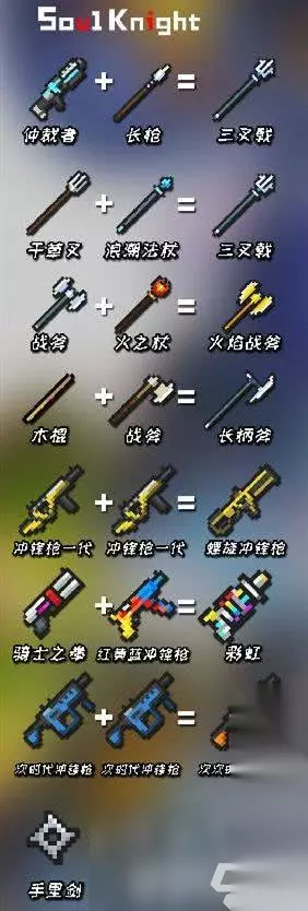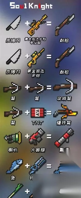 元气骑士武器合成表2024最新 一、雪狐系列武器 雪狐+雪狐=大雪狐 大雪狐+大雪狐=巨雪狐 雪狐土豪金+樱花霰弹枪=雪狐玫瑰金 二、时代系列武器 欠欠+欠欠=欠时代 欠+欠=次时代 次+次=次次时代 次次+次次=次次次时代 次次次+次次次=次次次次时代 三、手枪 破旧的手枪*4=妙妙枪 p250+p250=双管手枪 冰鹰+火鹰=冰火鹰 两种不同鹰类手枪+樱花霰弹枪=嘤嘤鹰 自动-半自动步枪/冲锋枪 杀猪刀+老旧的狙击枪/狙击步枪=刺枪 杀猪刀+黄金狙击步枪/专业版=刺枪 冲锋枪一代+冲锋枪一代=螺旋冲锋枪 熔炉+冰川=极光 突击步枪+突击步枪=强化突击步枪 四、霰弹枪 红黄蓝冲锋枪+骑士之拳=彩虹 彩虹+加特林=彩虹加特林 闪电法杖+骑士之拳=天堂之拳 五、导弹火箭 喇叭+火箭炮=聚爆 激光/能量武器 网瘾少年+网瘾少女=羊叫兽 仲裁者+仲裁者=散射激光枪 六、弓弩 英雄弓+风之弓=魔法弓 弓+弓=巨弓 强弓+强弓=巨弓 弓+强弓=巨弓 弩+弩=攻城弩 攻城弩+炸药包=爆炸弩 七、近战武器 破碎的剑柄+破碎的剑刃=重铸的圣剑 战斧+火之杖=火焰战斧 锤子+炸药包=爆炸战锤 火焰剑+冰霜剑=雷剑 光剑红+光剑绿+光剑蓝=光剑土豪金 浪潮法杖+干草叉=三叉戟 仲裁者+长qiang=三叉戟 仲裁者+标枪=激光枪 冰锥+标枪=冰枪 木棍+斧子=长柄斧 八、法杖 木棍+大葱=自然法杖 九、投掷武器 手里剑+手里剑=风魔手里剑 十、生活武器 塞子+塞子=拔粪宝 无尽蓝+无尽红=无尽紫 鱼+碎冰者=激光鱼 十一、武器+喷漆配件=新武器 法杖+黄金喷漆=黄金法杖 左轮+黄金喷漆=黄金左轮 狙击步枪+黄金喷漆=黄金狙击步枪专业版 织网者+绿色喷漆=绿色织网者 加特林+蓝色喷漆=蓝火加特林 十二、食品武器+便捷式烤炉配件=熟了的可食用武器 萝卜+烤炉=烤萝卜 大葱+烤炉=烤大葱 肉+烤炉=烤肉 鱼+烤炉=烤鱼 激光鱼+烤炉=烤激光鱼 尚方宝剑+烤炉=烤尚方宝剑 十三、器+进化配件=高等级武器 大巫师的旧法杖=时间装置=大巫师之杖 离子轨道炮+进阶套件=离子轨道炮第二代 雪狐系列冲锋枪+进阶套件=提升雪狐等级