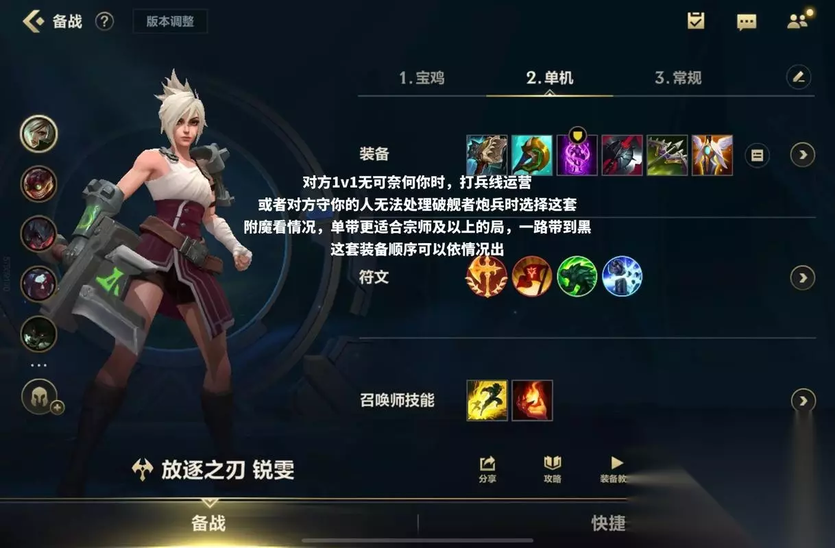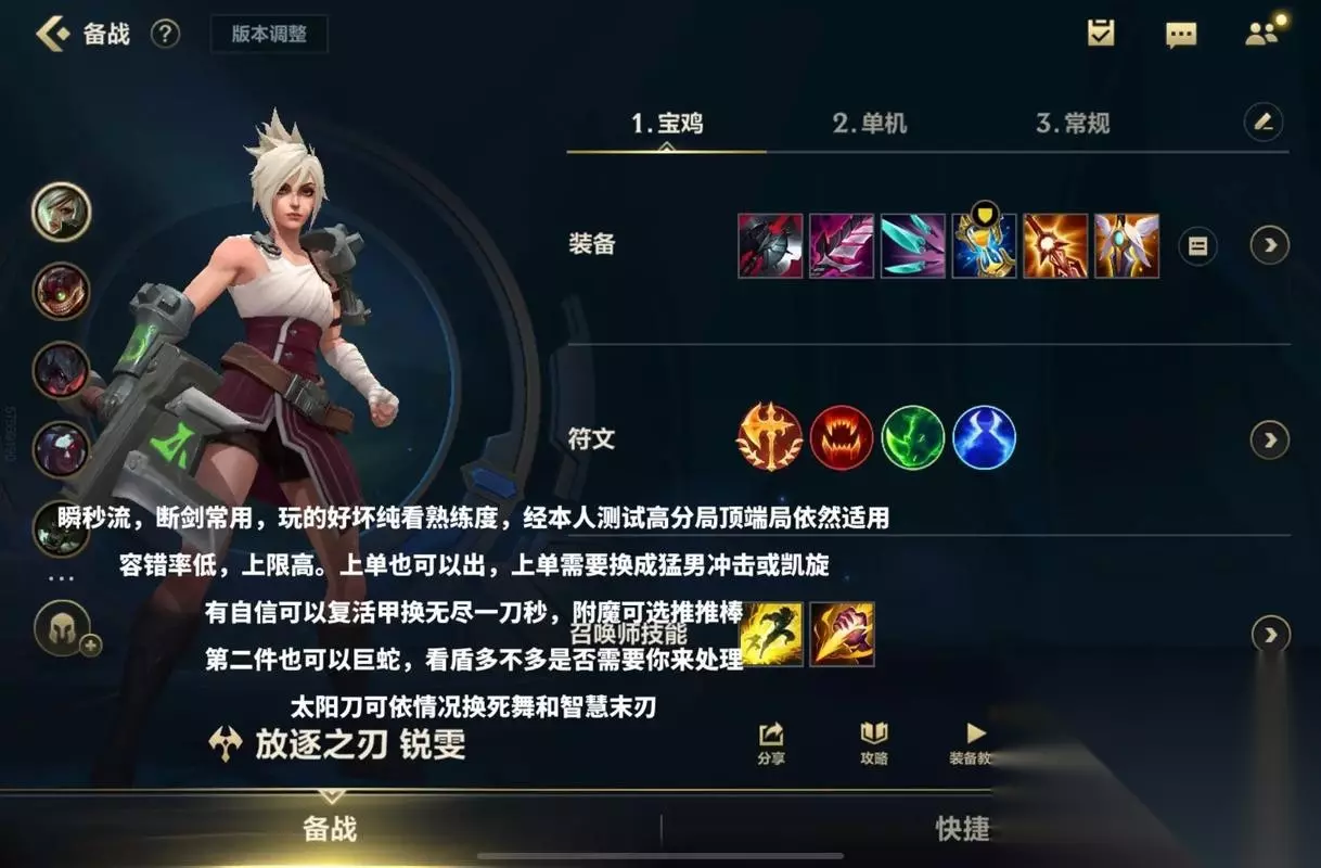 出装思路:冷却与生存并重 锐雯的出装核心在于缩短技能冷却时间,同时保证足够的生存能力。 首件装备选择黑色切割者是最佳选择,提供的冷却缩减、破甲和生命值完美契合锐雯的需求。面对高护甲英雄时,黑切的破甲效果能让锐雯持续造成威胁。 第二件贪欲九头蛇弥补了锐雯的清线能力,被动范围伤害让锐雯在团战中能对多个敌人造成威胁,主动效果还能重置普攻后摇,配合光速QA打出更高爆发。 鞋子的选择需要根据对局情况灵活调整:冷却鞋让技能衔接更流畅,护甲鞋应对物理爆发,水银鞋面对控制较多的阵容。中期补出死亡之舞或斯特拉克的挑战护手,前者提供伤害延迟转化,后者增加生存能力。 后期装备选择守护天使增强容错率,即便被集火击杀,复活后仍能依靠技能位移撤离或继续作战。板甲提供的移速加成让锐雯的机动性更上一层楼。