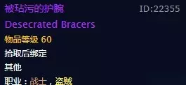被玷污的护腕需要玩家在纳克萨玛斯副本后通过击杀副本中的阿努布雷坎(44.0,23.6)、 黑女巫法琳娜、格拉斯后几率掉落获得,职业战士,盗贼,需要等级60,是无畏护腕、 骨镰护腕的任务目标物品。