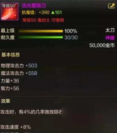 装备后可以提高539的物理攻击,596的魔法攻击力,342的独立攻击力,42的力量,63的智力和416的抗魔值。 流光星陨刀适合什么职业 流光星陨刀在游戏中的等级是五十级,非常适合火属性攻击的角色使用。 例如狂战士和鬼剑士,可以进一步提升火属性伤害,让你能够快速击败敌人。
