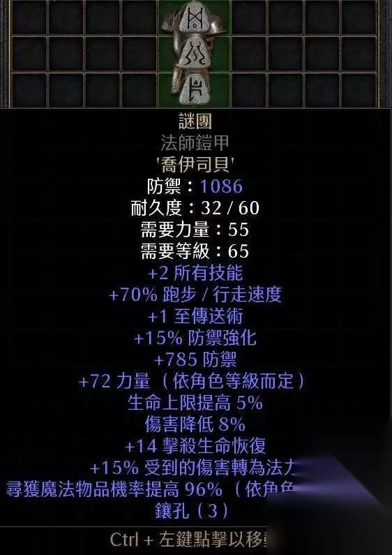 盔甲选用谜团,俗称脱贫甲。带TP和MF,还有高额力量。这游戏有传送和没传送是两种游戏体验,哪怕不需要BUG超市,也能增加效率。顺带一提,BUG超市是不计算MF的,因此要选择通刷超市。