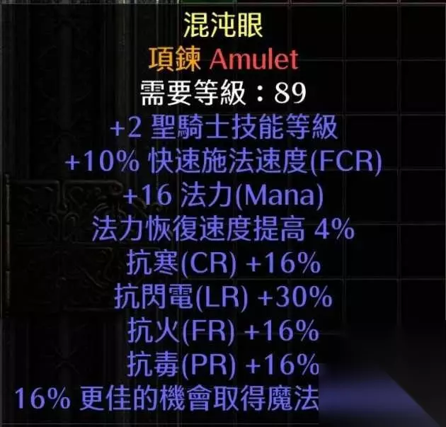 项链要求10FCR,黄或橙项链都可以。尽量有圣骑士技能和高MF,其他不做要求。因为手上没有10FCR的,就拿这幅图代替。