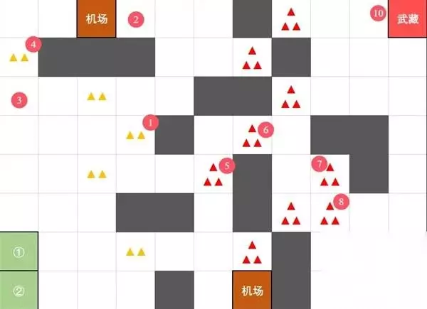 再列一下过图顺序,16图的怪是固定位置的。需要注意的是靠近才显示敌方种类,所以不要直接点敌方,移动的时候一定要点空白处,我们的主力队是没有接侦查的资本的。