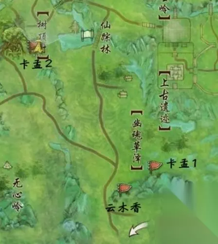 宠物任务的NPC会出现在上图标记的点中。 第一步,先到幽魂草泽找到卡孟——地图里的【卡孟1】 找到之后发现卡孟残血 不要大意地切奶毒吧! 就算你是单修毒经你也要奶! 奶满之后卡孟说了几句话 然后他消失了。 我们马上大轻功飞回树顶村。 卡孟大概在树顶村村字附近,一时间找不到可以在树下多转两圈 找到他之后接到一个任务 他让你帮他采药 接了任务之后飞回幽魂草泽 采到云香木之后飞回树顶村,找到卡孟交任务。 交了任务之后卡孟给你一个任务品【卡孟的感谢】。 之后就是重复这个任务七天。