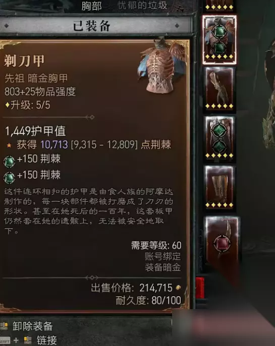 《暗黑破坏神4》剃刀甲属性一览 这个装备的词条是反伤,可以搭配野蛮人走反伤流派,也是一个非常不错的装备。 这件装备在属性上来说是相当不错的,组成是由食人族的阿摩达制作的。