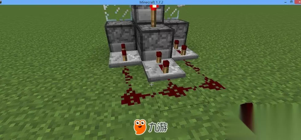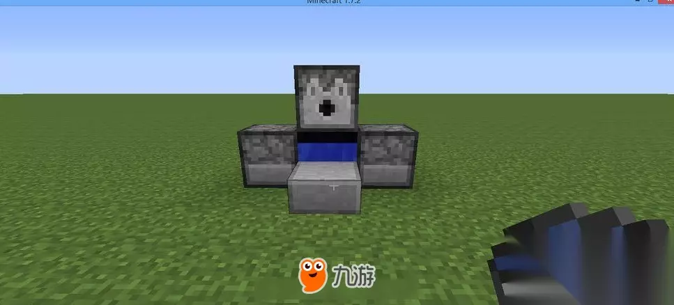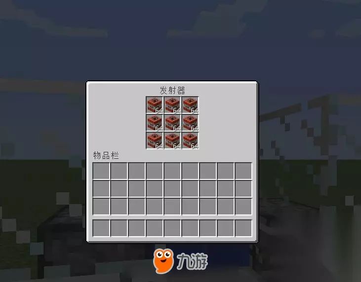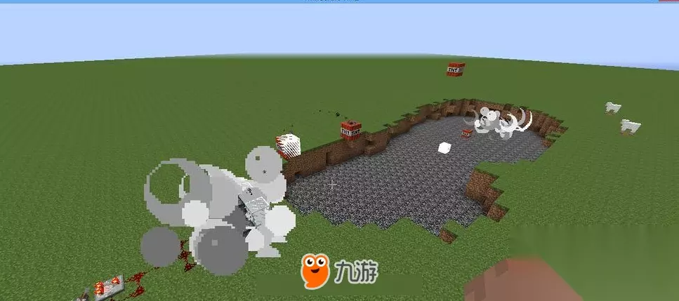 接着就是要考虑TNT爆炸后的范围问题。因为大炮是需要把TNT发射出去,但是又要保证TNT在发射时不能破坏地形,那么我们可以在大炮的面前放半块砖,然后在里面倒一桶水。因为水可以抵消发射时的作用力,所以可以保证大炮的稳定性。