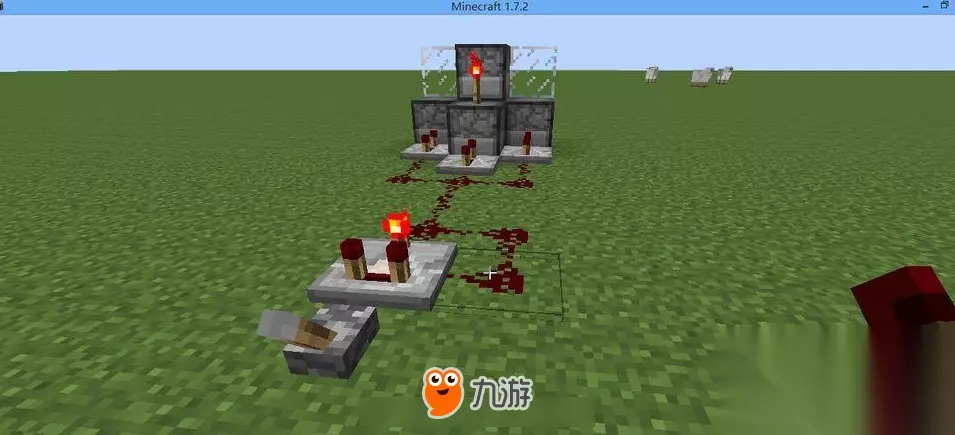 接下来就是如何使连射大炮能发动起来,我们需要在底层的三个发射器后面放三个中继器,并且把它们用红石链接起来,然后把中继器的延迟调到最高并且延伸出两个红石放一个比较器,把比较器点亮,再用红石把比较器链接刚刚的中继器的延伸线上。然后把拉杆放上。