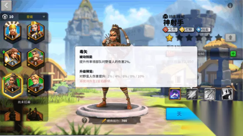 以上就是万国觉醒神射手天赋点怎么加 各玩法加点选择推荐了,神射手这个将领在前期作用还是比较不错的,大家可以通过加点来在挑战和打野上建立一定的优势,但后期还是没有用的,大家最好不要在她身上浪费过多的资源。