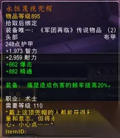 如字面意思。4片古手4只小鬼减cd8秒,强化地狱犬召唤2狗+2小鬼减cd8秒。注意只有召狗或者小鬼才减cd哦,别的宠物不会减的。 痛苦 永恒蔑视兜帽(头部):