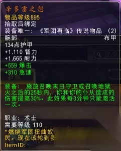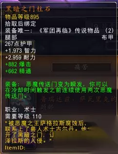 召唤大哥或者地狱火的时候自身会有一个30%的增伤持续25秒。内置CD3min,重新换装会导致3分钟内无法触发该buff。只能恶魔专精下拾取获得,但目前测试服情况是3系都能触发,估计是BUG。毁灭术用该护腕配合[灵魂神龛]单体非常爆炸。 卡扎克最后的诅咒(腰带):