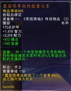 如字面意思。略微提升痛苦弱如狗的多线能力。图中buff是给4个目标上了痛苦无常后的buff 蕾瑟塔蒂丝的能量之索(腰带):