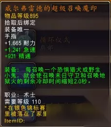 如字面意思。注意5%的伤害提升是加法提升,末日造成伤害瞬间根据场上宠物数量计算加成。一只宠物末日伤害x1.05,两只宠物末日伤害x1.1,三只宠物末日伤害x1.15......恶魔术单体boss平稳阶段一般能保证9只以上宠物同时存在,该腰带提升末日伤害至少45%以上。考虑到恶魔特质对末日的加成,提升只能算是中规中矩。 威尔弗雷德的超级召唤魔印(戒指):