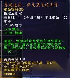 术士除大哥外唯一的减速。这是一个对dps看似没有什么提升的骚装备。在某些需要风筝的战术中可能有奇效。在痛苦aoe方面也有建树:远处来了一堆怪,第一时间上种子引爆群体腐蚀术减速,这样小怪就走很久才能走到近战位,你也就可以抢很多aoe伤害啦! 通用 普瑞达兹,萨瓦里克的杰作(颈部):
